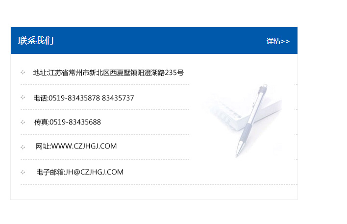 地址:常州市新北區友邦商務大廈1幢16、17層  電話:0519-85101652  傳真:0519-85112595  郵編:213022  網址:www_cz-jiayue_cn.zyzssj.com  郵箱:xiajifengaa@163.com
